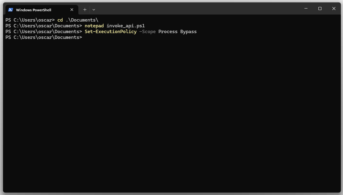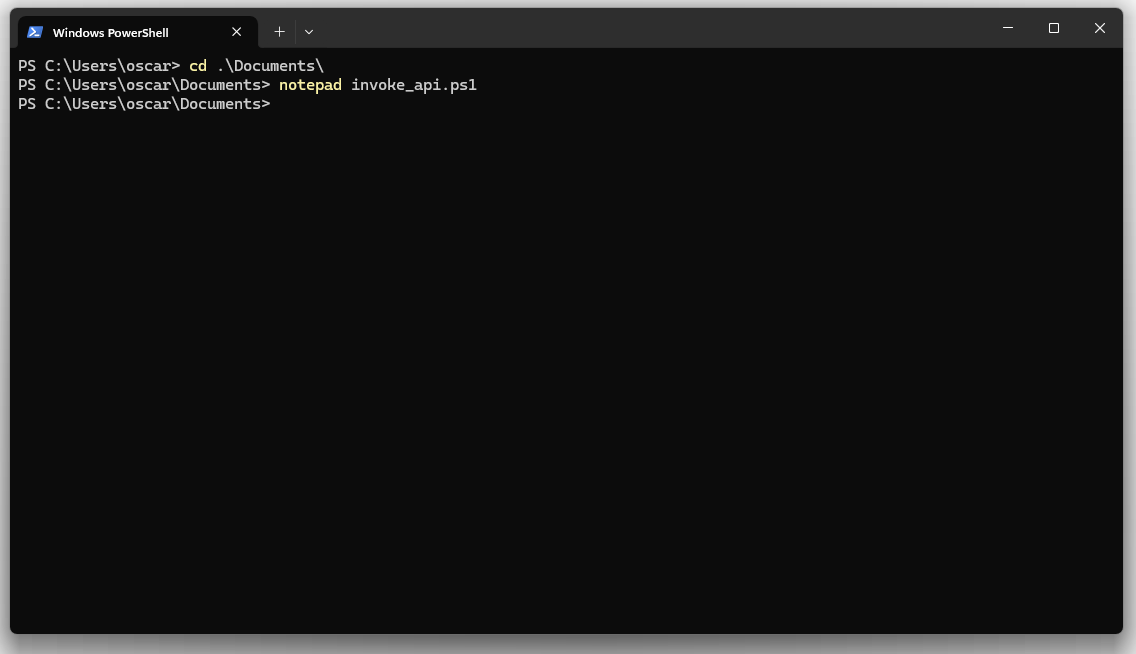 Execute the following command to create and open a new PowerShell script: notepad invoke_api.ps1